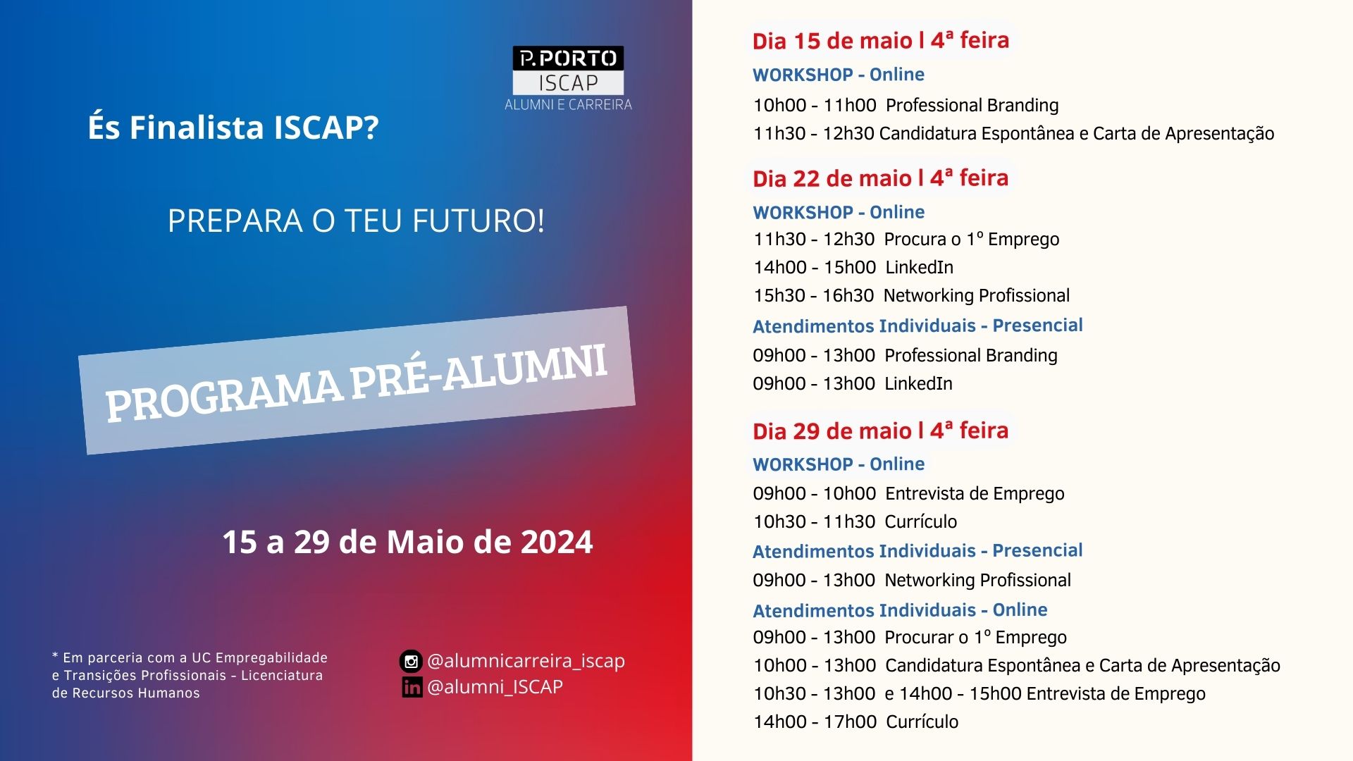 O “Programa Pré-Alumni”, destinado a alunos finalistas do ISCAP, desenvolvido pelo GAC e por estudantes da Licenciatura em Recursos Humanos no âmbito da unidade curricular de Empregabilidade e Transições Profissionais, será composto por workshops e atendimentos individuais inseridos na temática da Empregabilidade.