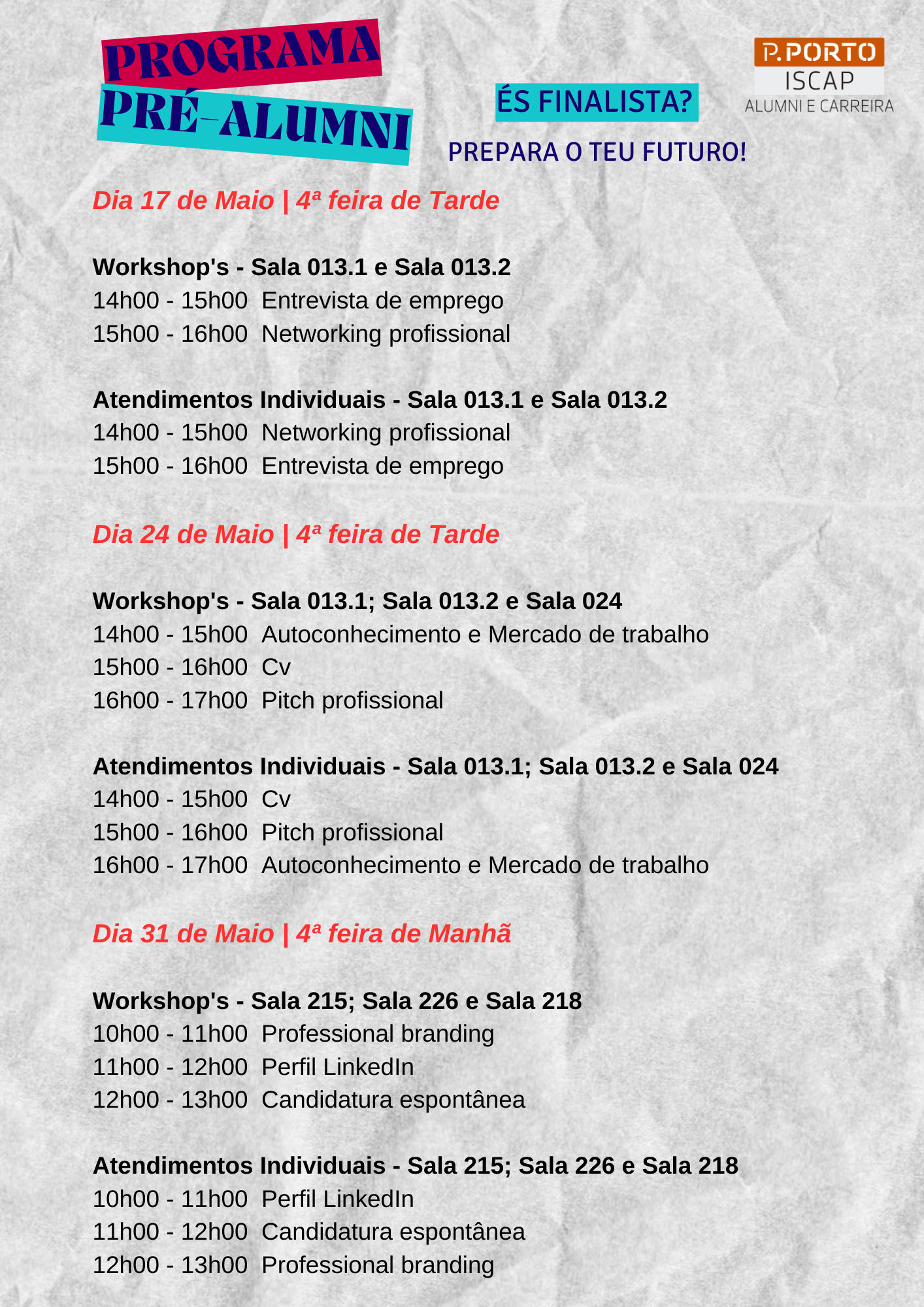 O “Programa Pré-Alumni”, destinado a alunos finalistas do ISCAP, desenvolvido pelo GAC e por estudantes da Licenciatura em Recursos Humanos no âmbito da unidade curricular de Empregabilidade e Transições Profissionais, será composto por workshops e atendimentos individuais inseridos na temática da Empregabilidade.