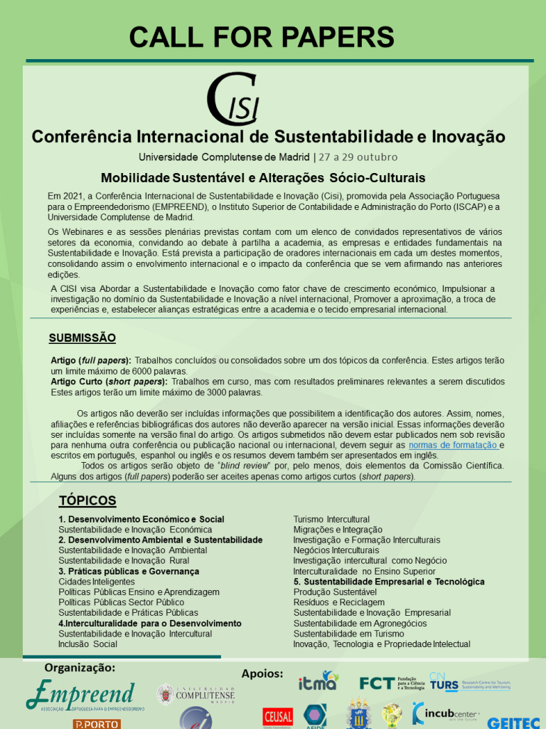 Call for Papers| International Conference on Sustainability and Innovation – Sustainable Mobility and Socio-Cultural Changes, Universidade Complutense de Madrid, October 27-29.2021, Events, News