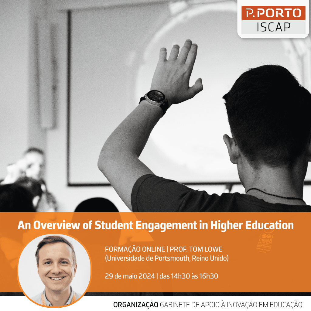 No próximo dia 29 de maio, o GAIE organiza a ação de formação “An overview of student engagement in higher education”, que terá como convidado o Prof. Tom Lowe da Universidade de Portsmouth (Reino Unido). Esta formação destina-se aos docentes do ISCAP, abordando a questão do envolvimento dos estudantes nas instituições de ensino superior de uma forma transversal.