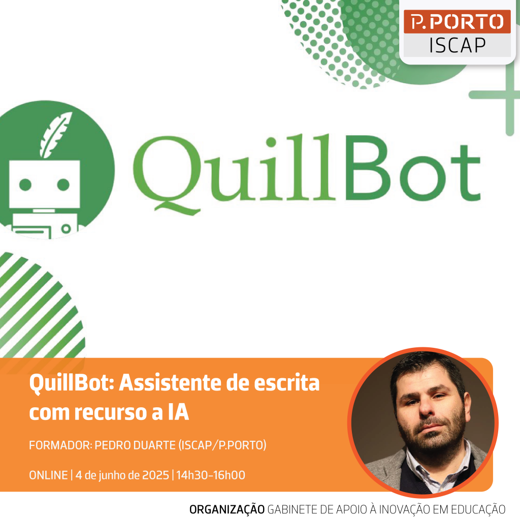 No próximo dia 04 de junho realiza-se a ação de formação “QuillBot: Assistente de escrita com recurso a IA”. A formação, em formato online, destina-se aos Docentes do ISCAP e tem como objetivo mostrar as funcionalidades da ferramenta QuillBot enquanto assistente de IA para a escrita académica.