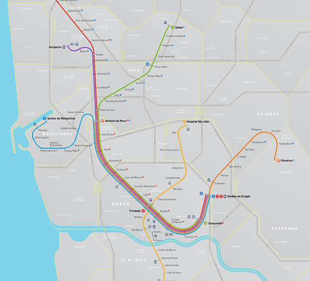 Metro’s Line E (violet) connects the Airport Station to the Estádio do Dragão Station.